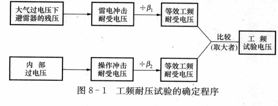 ? ? ? ? 通常,除了型式試驗(yàn)和操作沖擊試驗(yàn)外,對(duì)于3~220kV的低、中、高壓系統(tǒng),因操作或雷電沖擊電壓對(duì)絕緣的作用可用工頻電壓等效,所以,一般對(duì)電氣設(shè)備只作1min工頻耐壓試驗(yàn),其確定程序如圖8-1所示。β1、β2為雷電沖擊和操作沖擊電壓的沖擊系數(shù)。