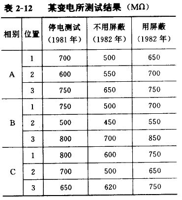 ? ? ? ?表2-12列出了某變電所66kV避雷器均壓電阻的測試數(shù)據(jù).由表中數(shù)據(jù)可以看出,使用屏蔽法測得的結(jié)果很接近一年前停電測試的數(shù)據(jù)(經(jīng)過一年.均壓電阻實際上可能有些變化),但不用屏蔽測量的結(jié)果都明顯偏低,相差100-200MΩ不等。