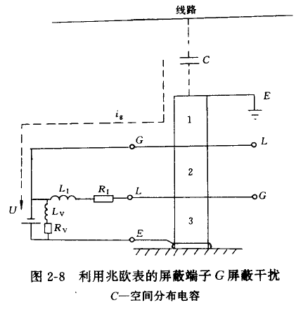 ? ? ? ?(3) 利用兆歐表的屏蔽端子G屏蔽。對于兩節(jié)及以上的被試品,例如避雷器、耦合電容器,可用圖2-8所示的接線,圖中將端子G接到被測避雷器上一節(jié)的法蘭上,這樣,干擾電流由端子G經(jīng)表的電源入地,而不經(jīng)過電流線圈,從而避免了干擾電流的影響,對上節(jié)避雷器,可將其上法蘭接兆歐表E端子再接地,使干擾電流直接入地(見圖2-8右側(cè)接線)。
